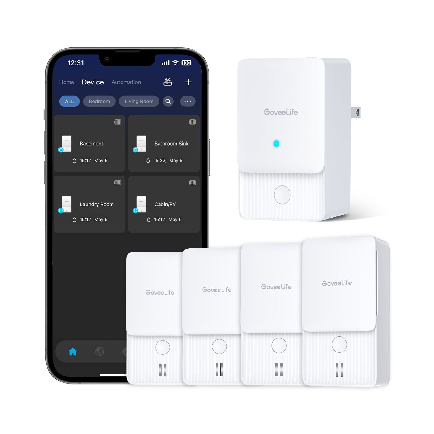 Keep your home protected from undetected water damage within your home, including garages and basements, with the GoveeLife Water Leak Detector. These smart water alarms will automatically alert you via email or notification through Govee Home App if there are any water leaks. Note: If you want to receive an app alert, please must purchase a Wi-Fi gateway+sensors version, wifi gateway is not sold alone.