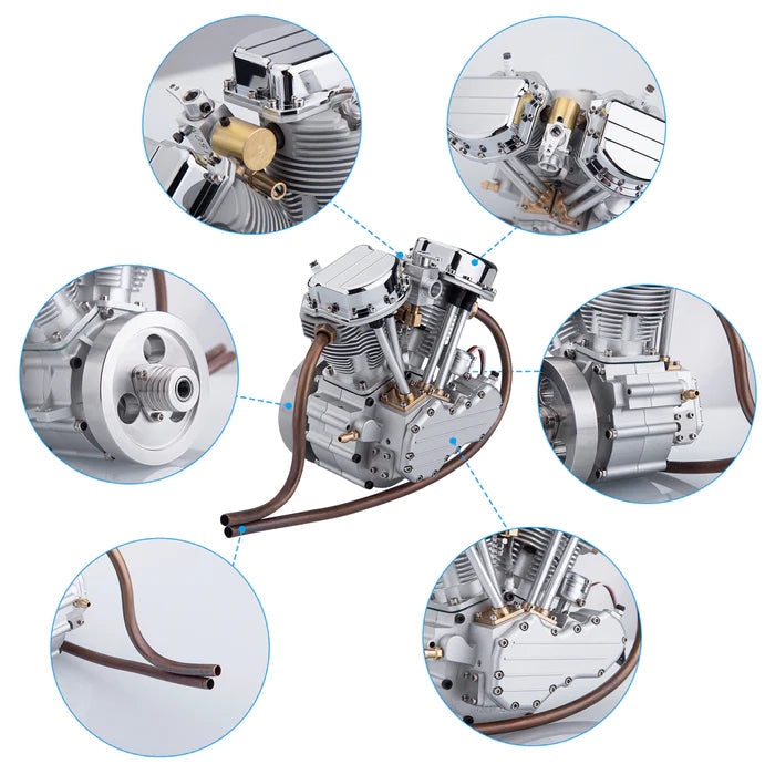 - En cuanto al mecanizado fino, el bloque de cilindros está fabricado en aleación de aluminio con mecanizado de precisión CNC, y los dos codos de escape de cobre son únicos. El acabado anodizado le da al bloque una superficie pulida, mientras que el cromado hace que las tapas de balancines sean aún más llamativas. El motor es una obra de arte visualmente atractiva y se mantendrá pulido durante mucho tiempo.
