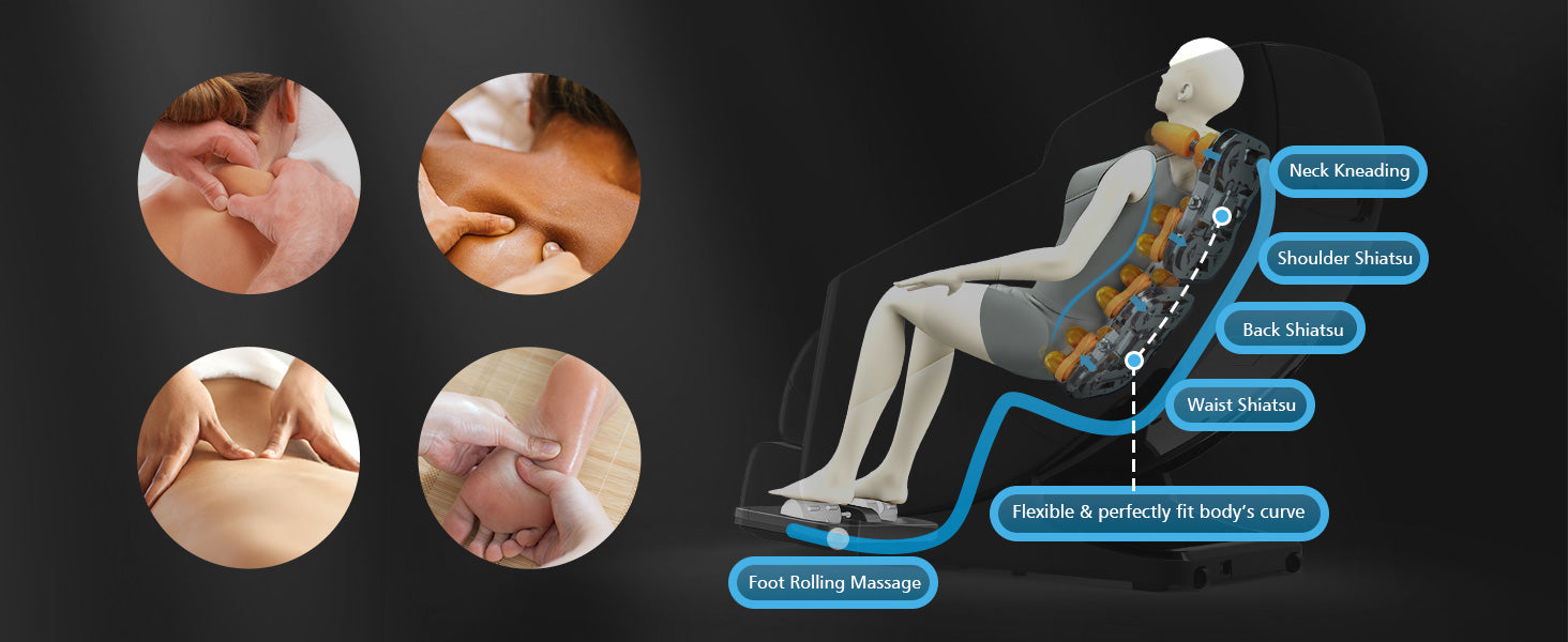 Cómodo sillón de masaje reclinable con 8 rodillos shiatsu y 14 bolas de masaje, flexible y que se adapta perfectamente a la curva del cuerpo, ofrece un masaje de amasamiento profundo 4D para cuello, hombros, espalda y cintura. Ayuda a aliviar nudos y dolores musculares, además de eliminar el estrés y la fatiga. 3 intensidades de shiatsu para adaptarse a sus necesidades. El masaje de pies con rodillos mima sus pies con comodidad. Se sentirá relajado y rejuvenecido.