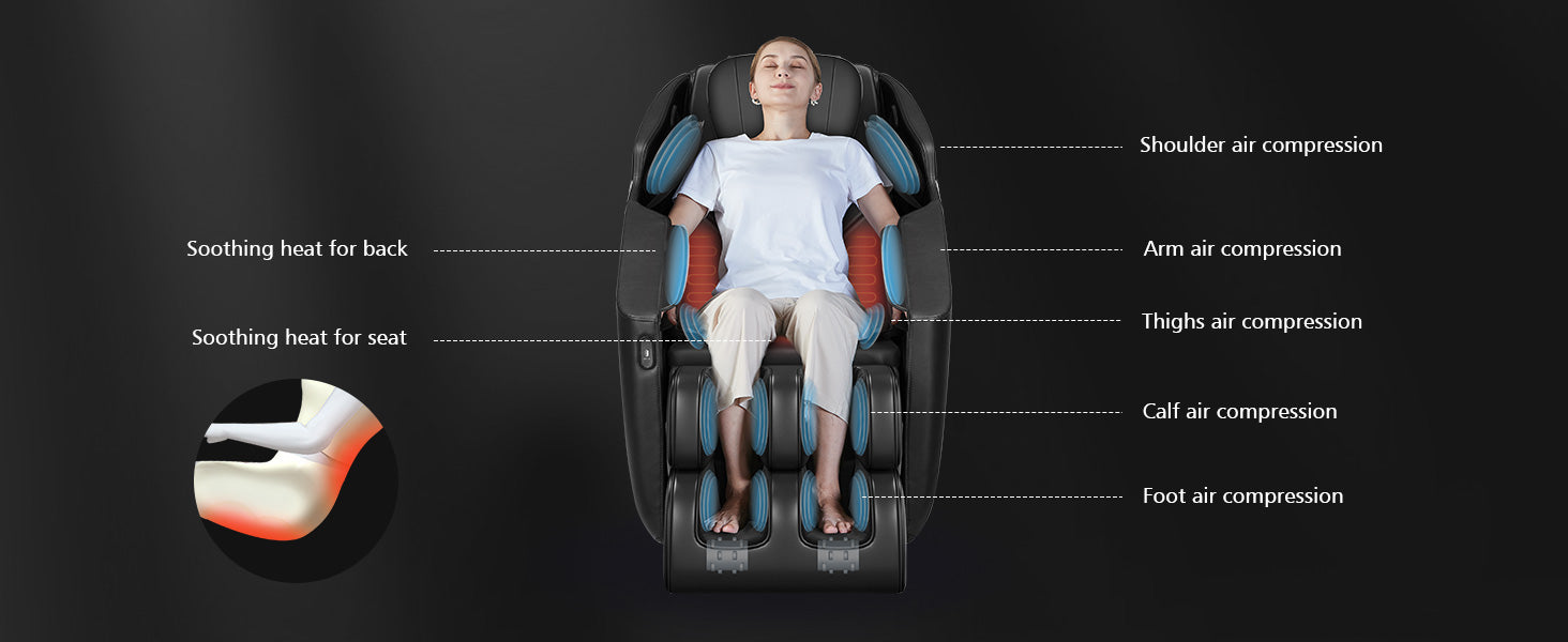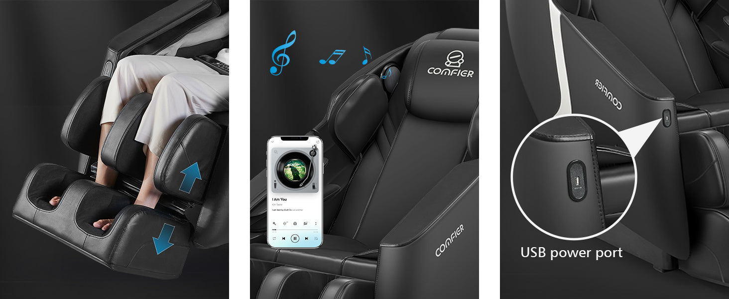 El sillón reclinable de masaje Comfier proporciona masaje con presión de aire para una cobertura total de hombros, brazos, caderas, pantorrillas, piernas y pies. 3 intensidades ajustables, 3 zonas de shiatsu selectivas y una función de calefacción opcional le permiten personalizar las configuraciones para obtener el masaje más cómodo.