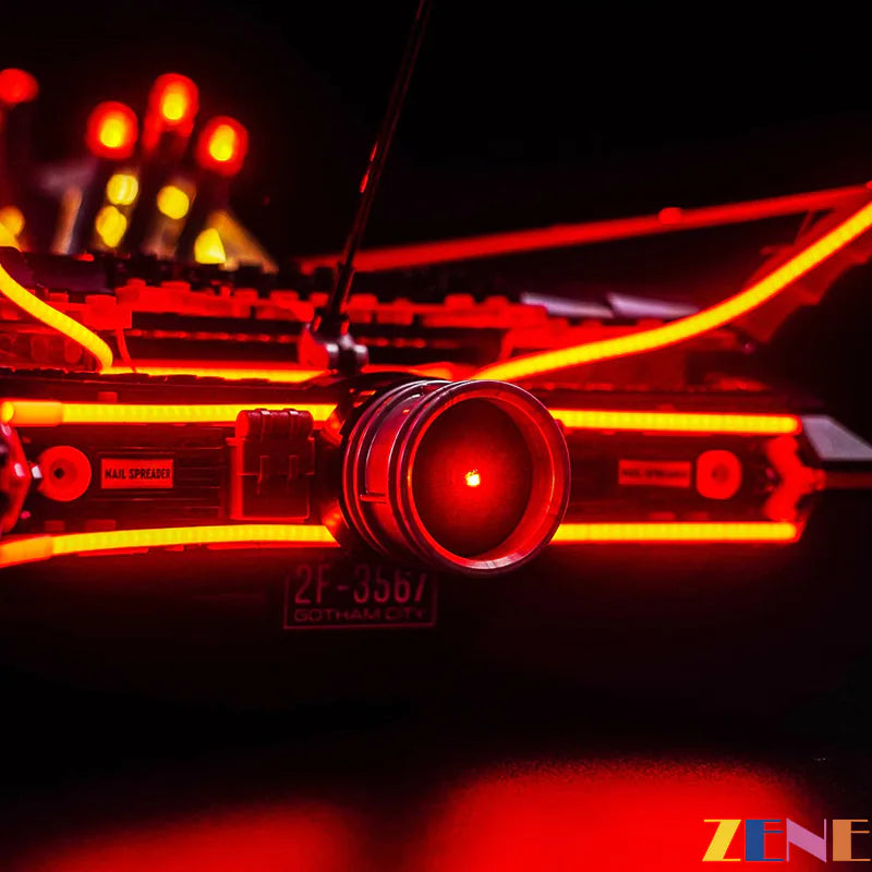 El kit de iluminación Z E N E Bricks para el Batmóvil LEGO Batman 76328 se inspira en el icónico Batmóvil retro de la serie de televisión de 1966. Su color principal es el negro con detalles en rojo. A juego con la minifigura de Batman, también presenta un diseño de inspiración retro, con un traje gris claro y azul oscuro, y lo que parece ser un nuevo estampado en el casco.