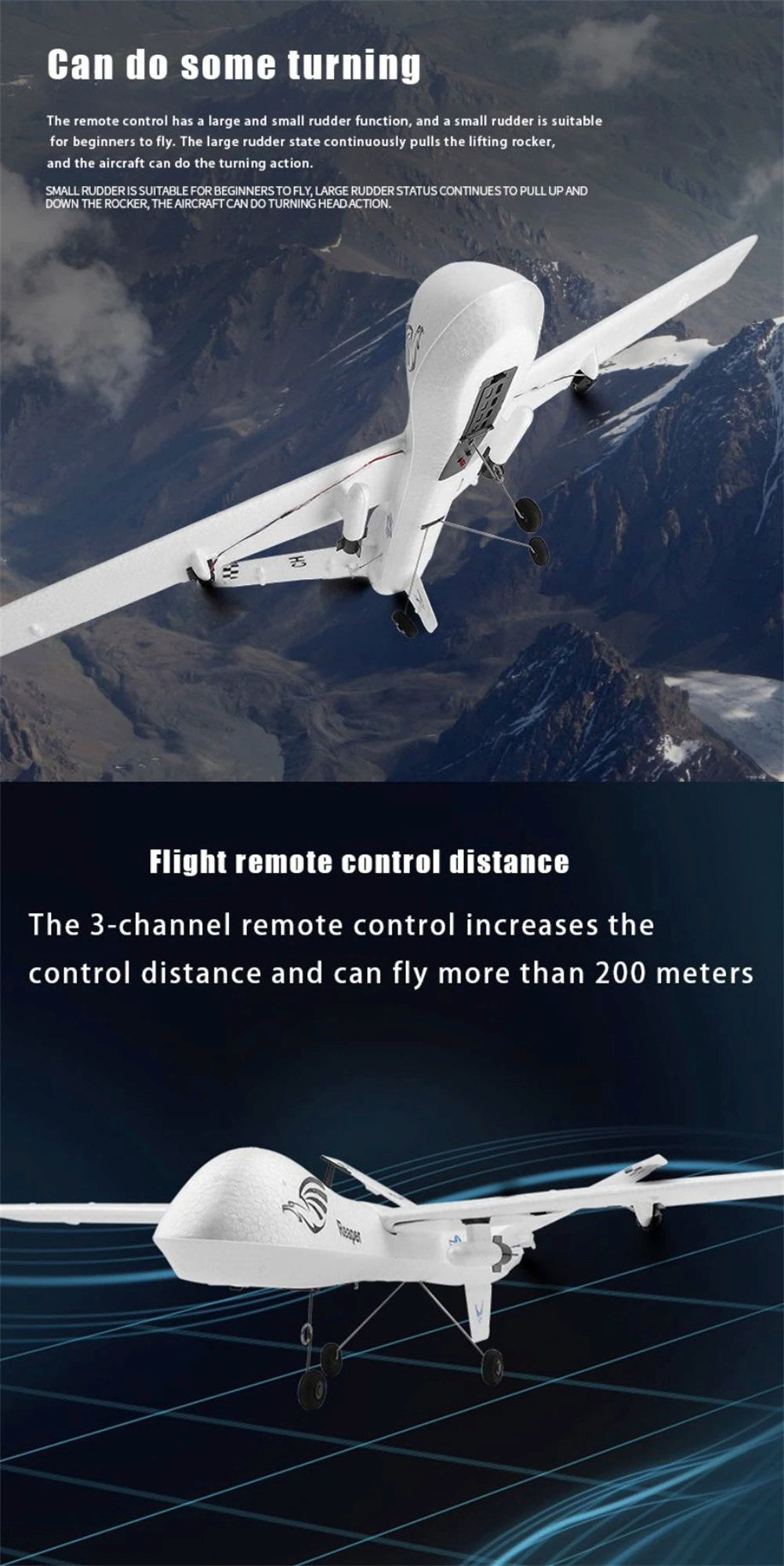 ¿ Conoces el caza dron MQ9 ? Este avión está diseñado a imagen del MQ-9, con una apariencia blanca espectacular. Tiene funciones de arriba/abajo, adelante/atrás, giro a la izquierda/derecha y giro 3D. Su peso en vuelo es de 67 g. El volumen del timón es ajustable y puedes girar 360 grados con la palanca arriba/abajo. ¡Es un excelente juguete de ala fija tanto para niños como para adultos!