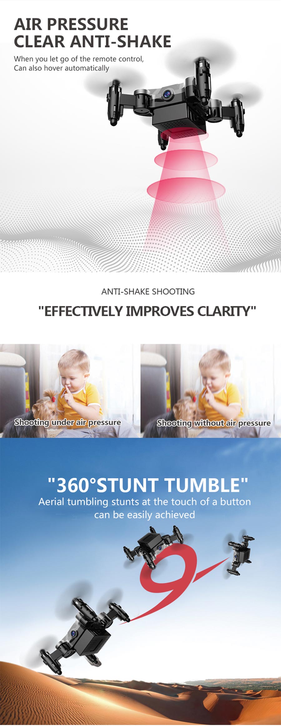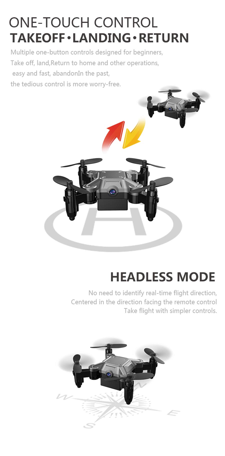 - Product function: Ascent/descend/turn left/turn right/forward/backward/fly left/fly right/hover/360°roll/Speed switch/Headless mode/One key return
