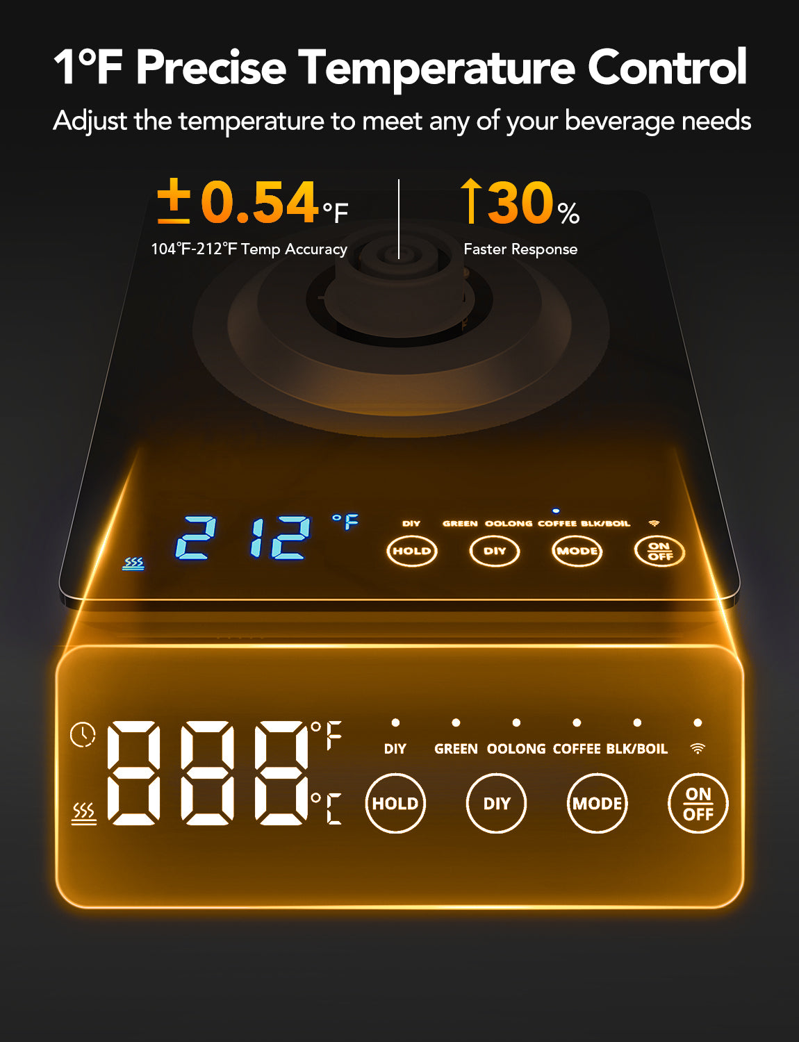 - 1°F Precise Temp Control: Set the temperature between 104°F and 212°F through the app for more precise temperature control.