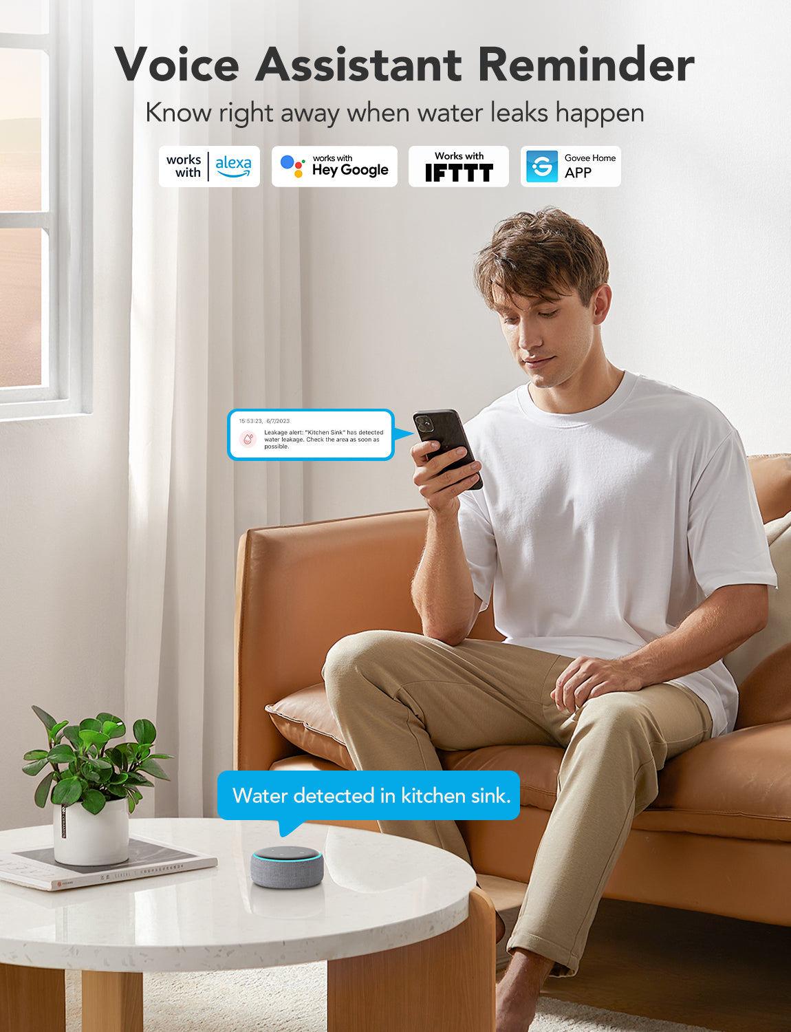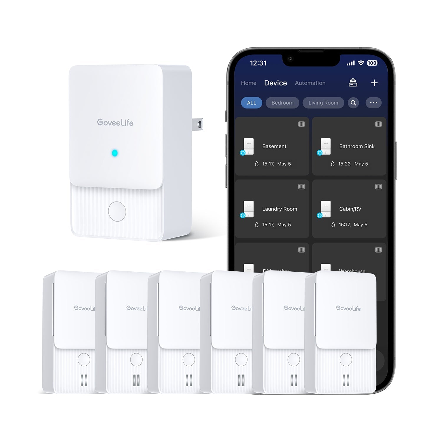 Keep your home protected from undetected water damage within your home, including garages and basements, with the GoveeLife Water Leak Detector. These smart water alarms will automatically alert you via email or notification through Govee Home App if there are any water leaks.
